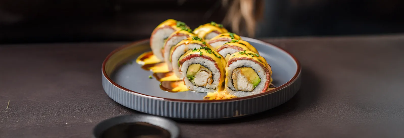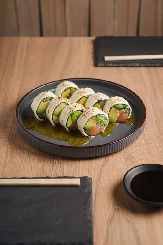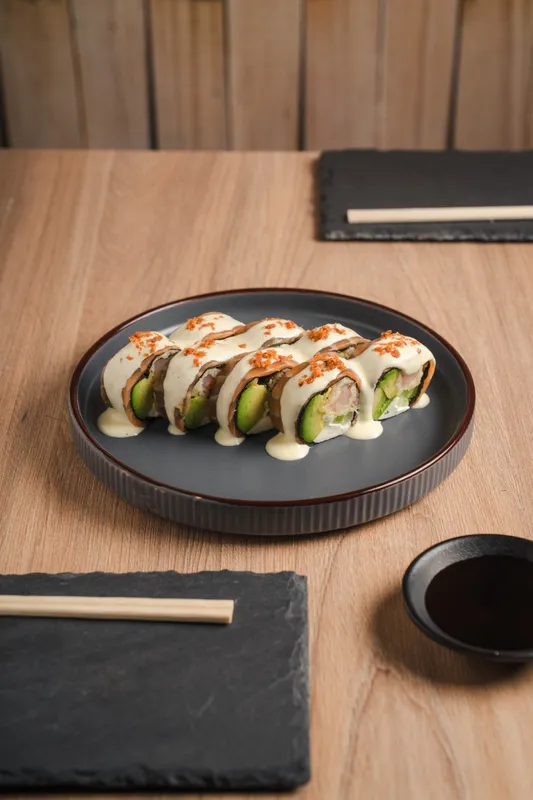 Camarón tempura, palta, envuelto en nori, acompañado de ceviche de salmón y camarón, con un toque de salsa acevichada.